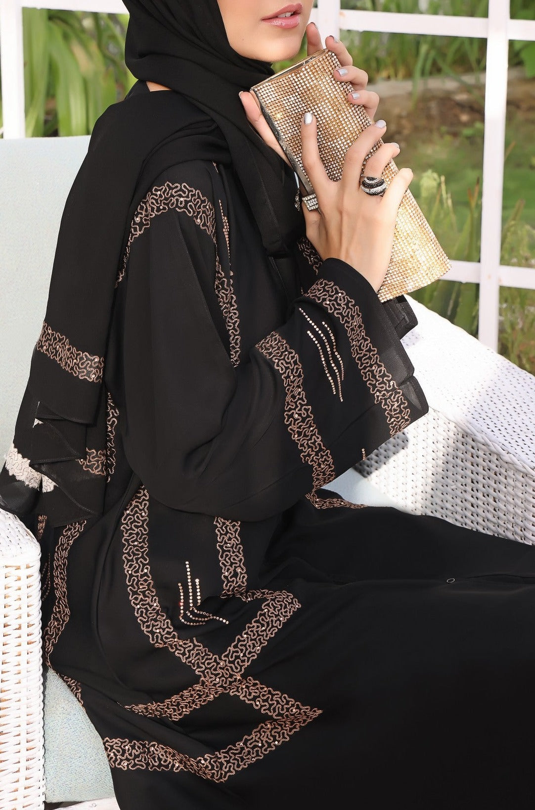 This eye catchingstone workon sleeves, complete side body abaya is a must for your wardrobe essential makes it compulsory to wear it in every occasion. The abaya comes along with Plain Chiffon Sheila.